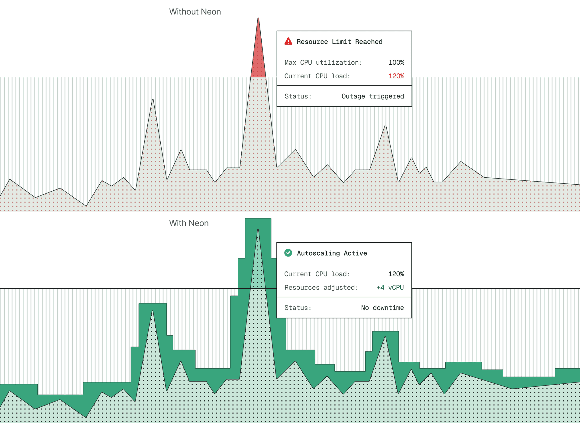 By separating compute and storage, Neon automatically scales CPU, memory and storage to fit your workload.